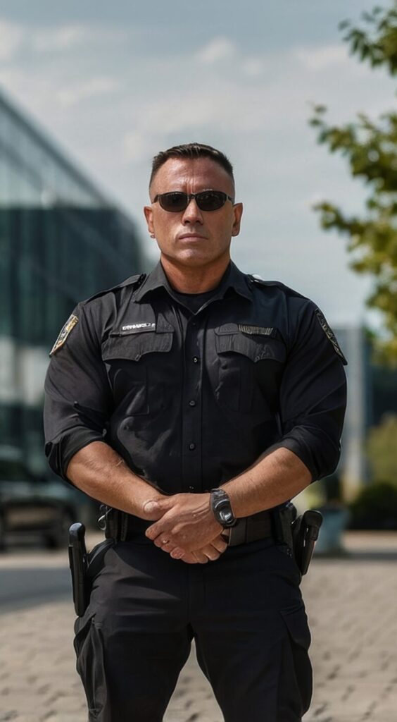Imagine a business suit or a crisp collared shirt with dress pants. This is the professional look for security officers.